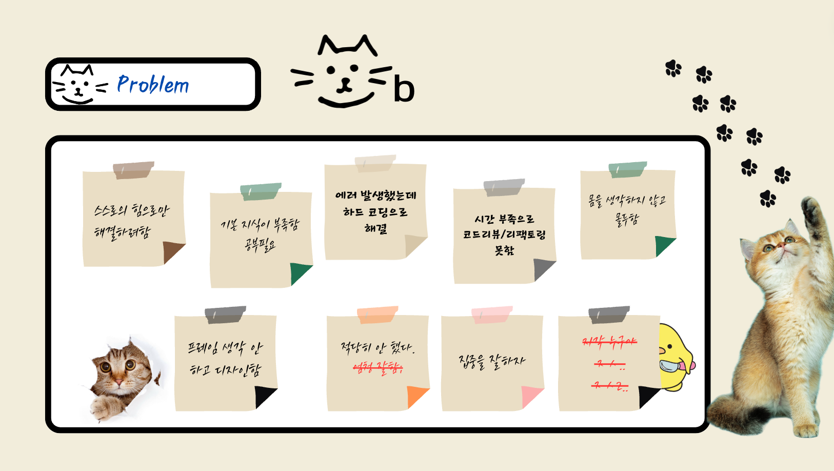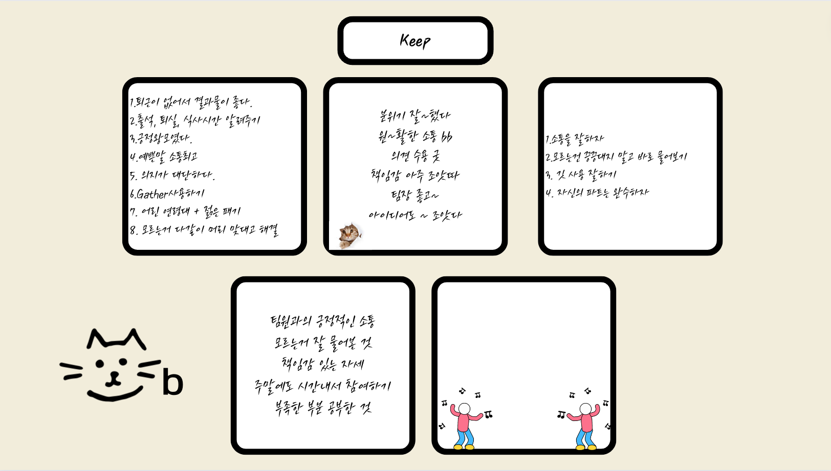 백엔드 부분이였으면 더 좋은 평을 들을 수 있었을 것 같다. 메인 표지에 영상을 이용해서 폭죽을 터트리는 것을 구현하였는데, 데이터의 용량이 커서 인터넷 연결상태나 컴퓨터 성능에 따라 다른식으로 값이 나올 수 있기에 구현하는 것도 좋지만 사전 테스트가 더 필요하다고 말씀하셨다. 그러한 것은 내일배움캠프 프로젝트에서는 지양해야 할 것 같다. 좋은 팀원들 만나서 많이 배우고 웃으며 프로젝트를 완성할 수 있었다. 여러 도움을 주셨던 팀원분(7조)들께 감사하며 팀원들과 같이 KPT 를 작성해보았다.