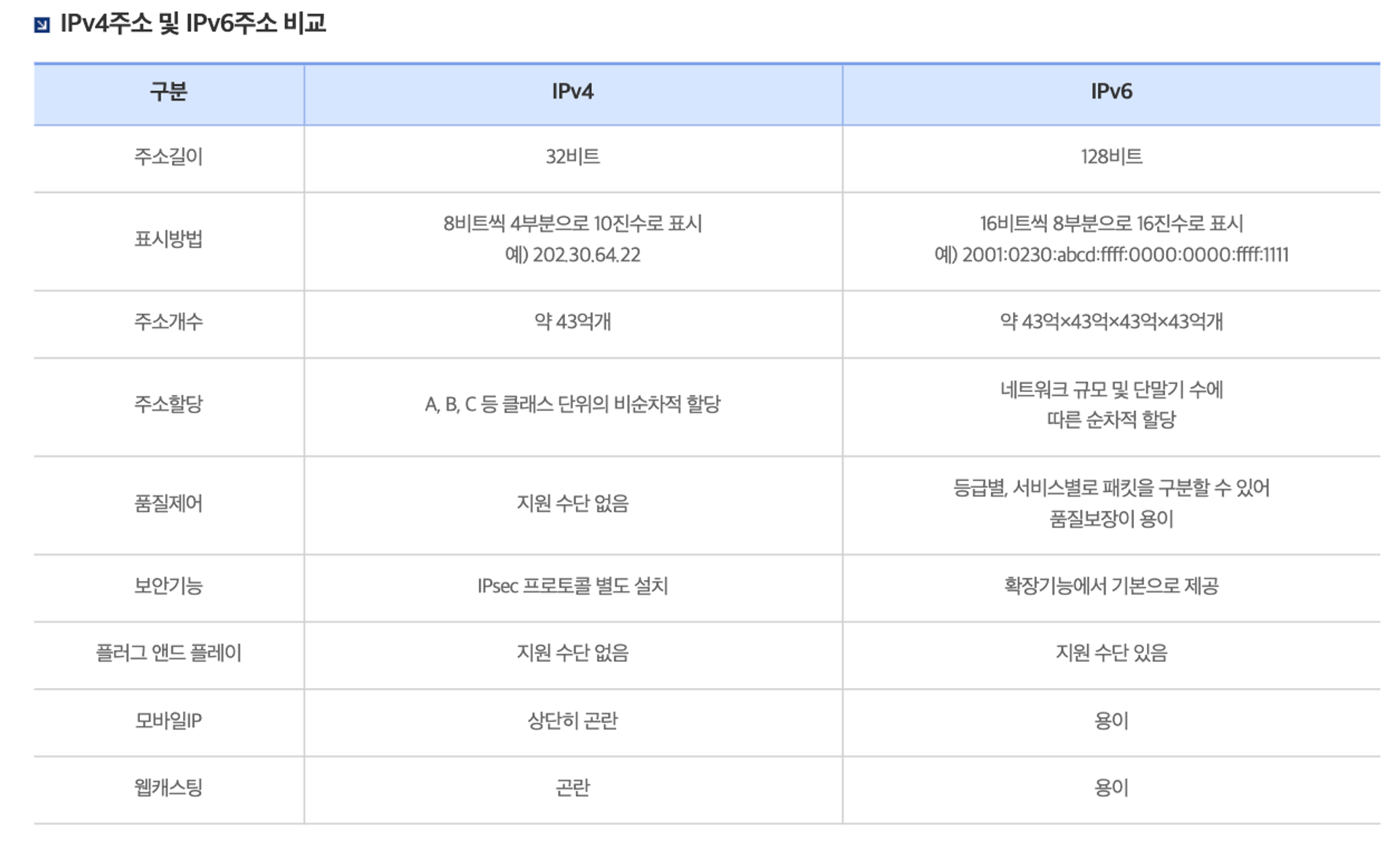 128비트 (16비트 8그룹) 의 IPv6 체계가 도입